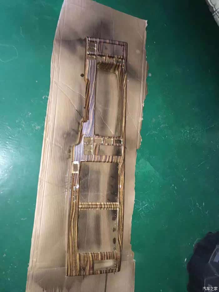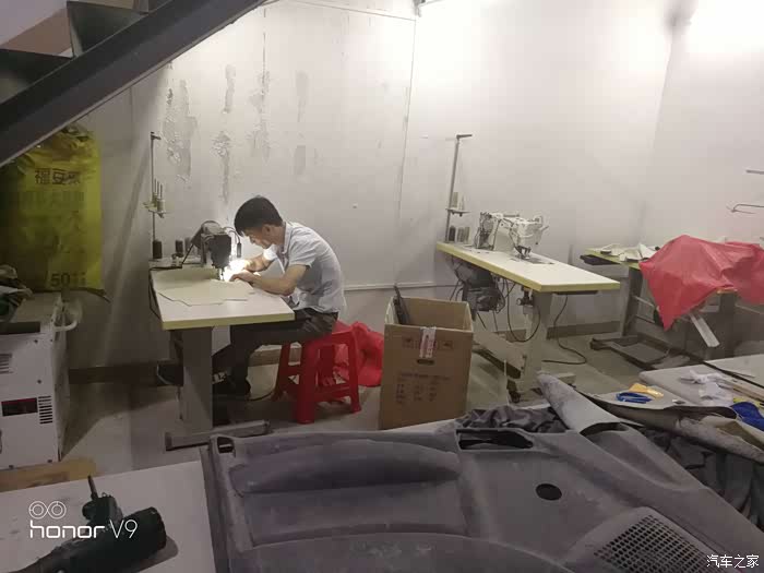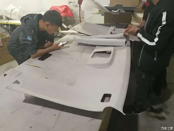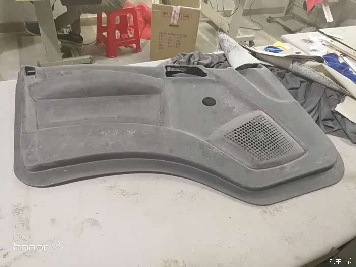 这块是已经弄好的。板是前面图片看到的板,但是皮已经不是前面附在板上那张皮了。因为是第一次包这个车型,师傅还不太熟悉,现在看到的这张皮,已经是师傅多次撕掉重包直到满意的结果了。