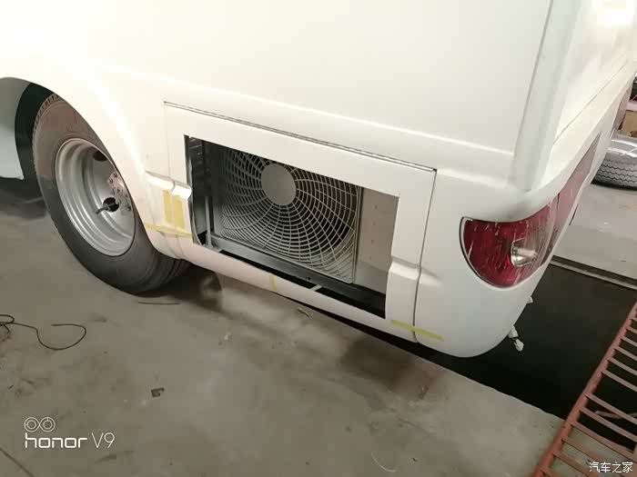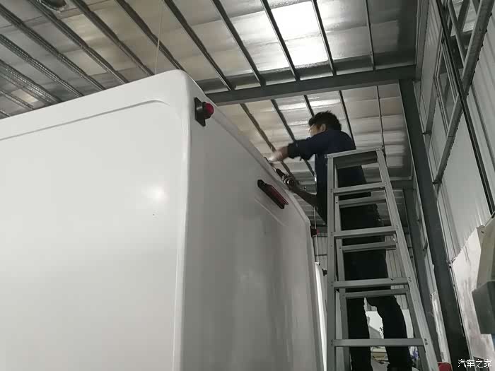 简洁的车尾,吊装箱体时留下的两个孔,车门只是方便进出开的一个小门,真正的门还没开孔。