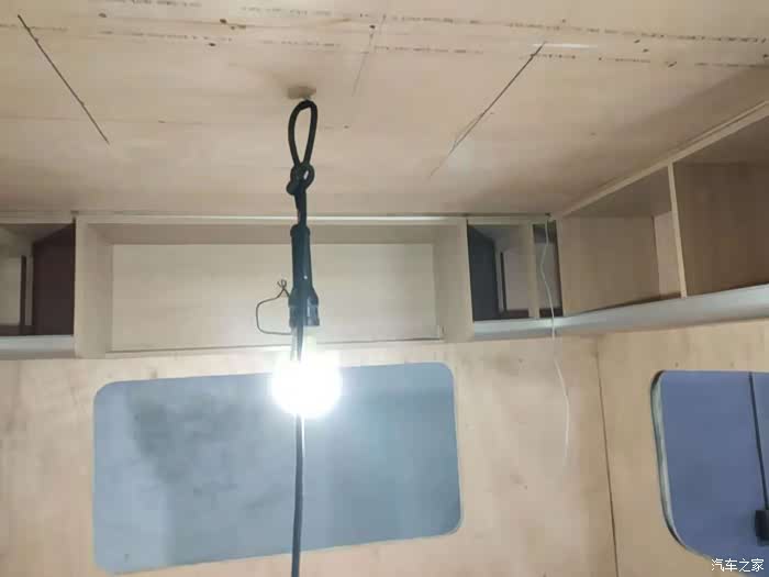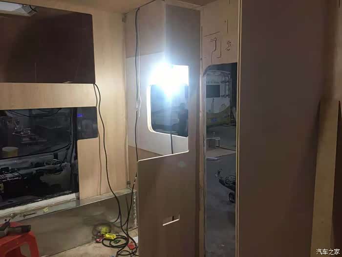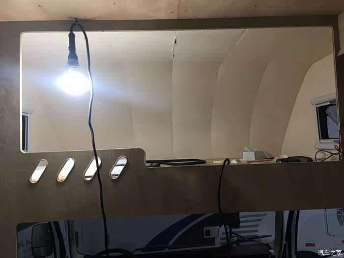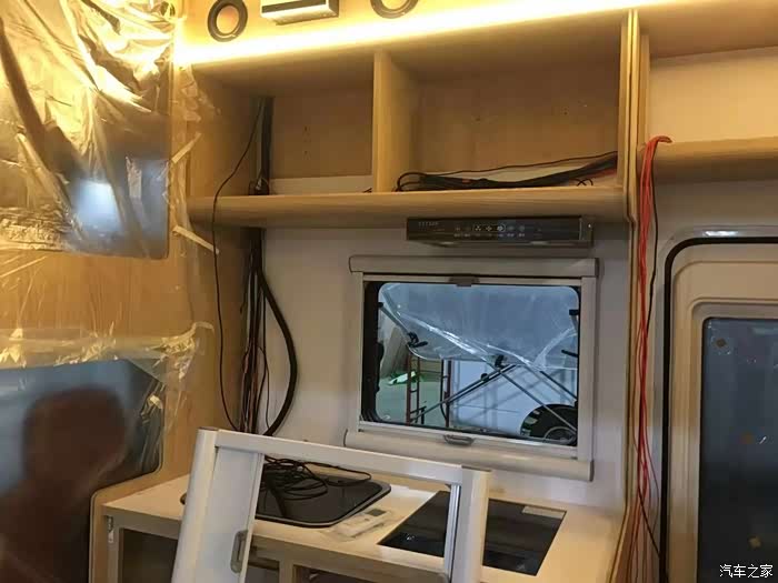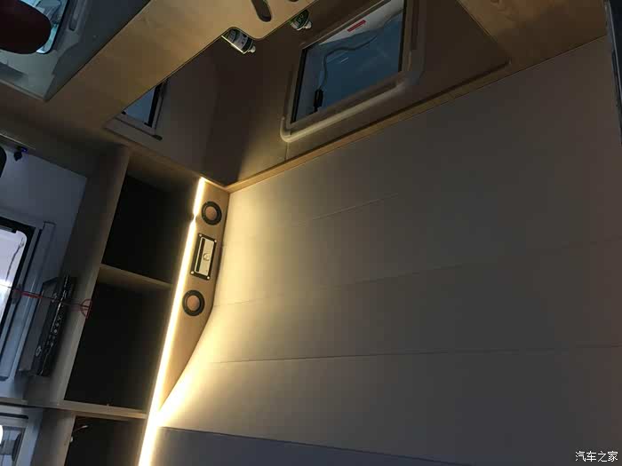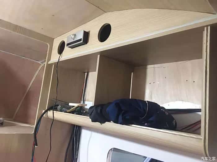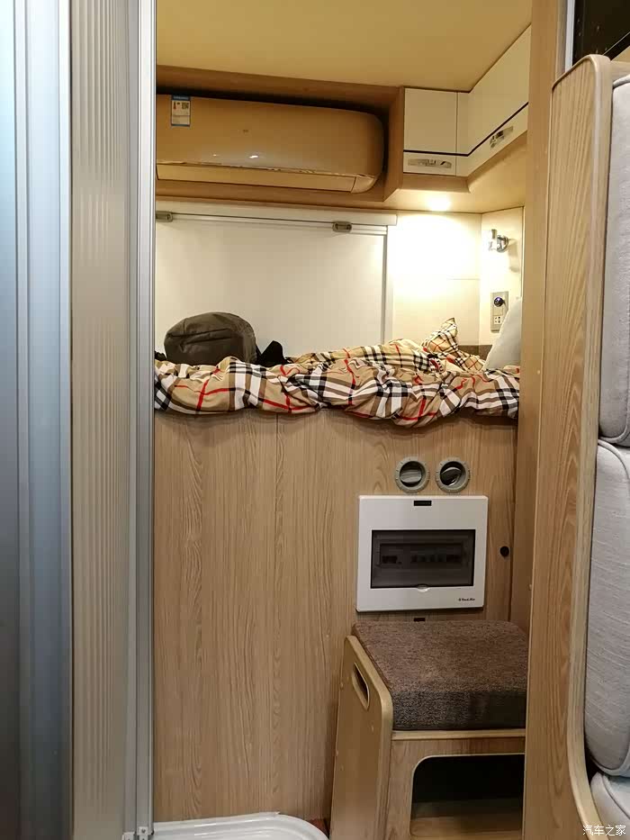 乘客门上本来计划放空调的,结果选空调的时候没有注意内机过长,只有放到车尾固定床,这里做成了吊柜。侧面是开关控制面板。