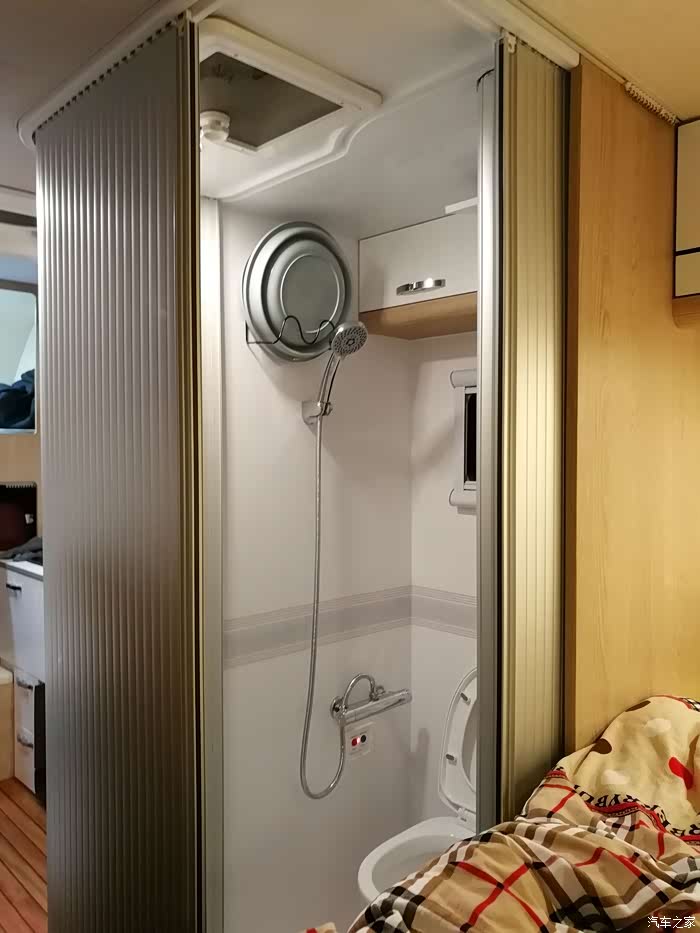 拓展卫生间,尺寸:900*750(1150),装有菲亚玛双向换气扇。卫生间拓展时,可以为卫生间换气通风,不拓展使用时,又可用于车内通风。当然,车内还有主要的Maxxfan换气扇。