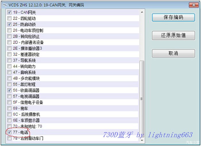 所有硬件安装完成了,下面就是软件改编码了。上万能的5053线,进网关安装列表,将77电话打勾,保存后退出。