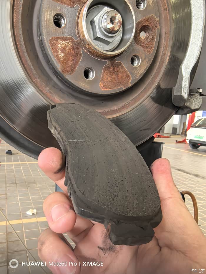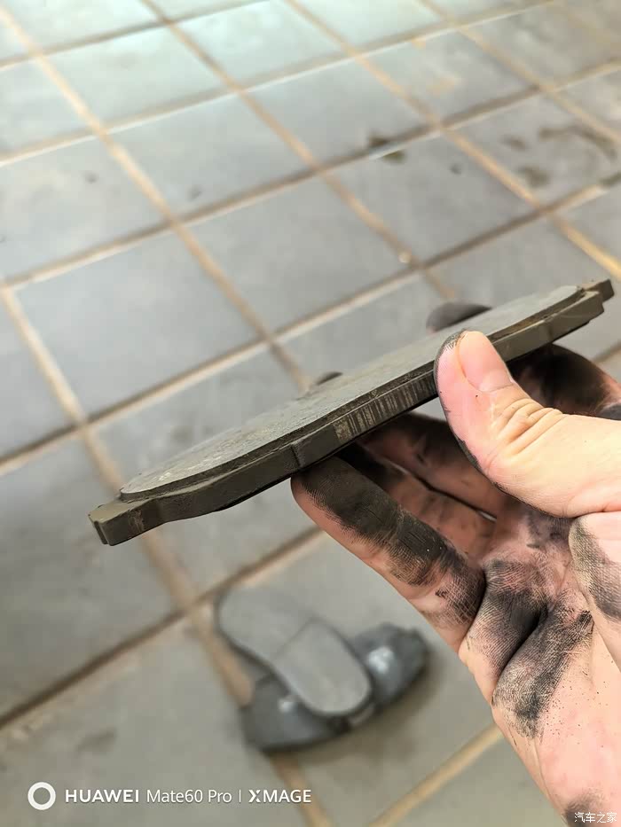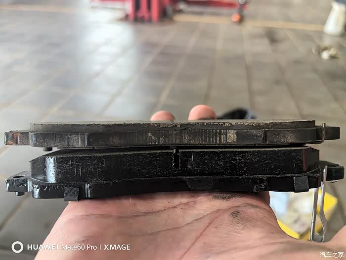 今天保养的时候检查发现前轮刹车片沟槽基本磨平了。2万多公里刹车片磨成这样可能跟云南多山路且平时驾驶比较激烈的原因有关。在售后花380更换了2副信亿陶瓷刹车片,看着挺厚实的,就是不知道质量如何。