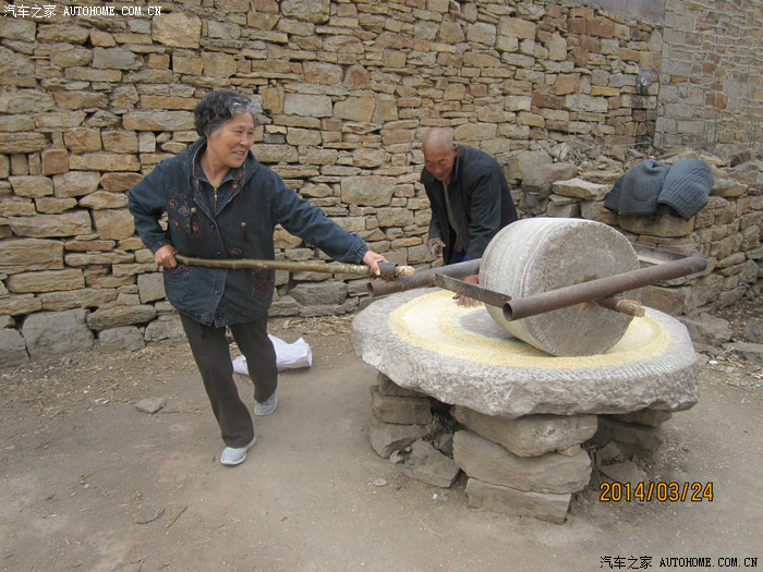 2014年,去沂水天上王城路上,看到81岁的老农在碾玉米,老伴又要秀一把!