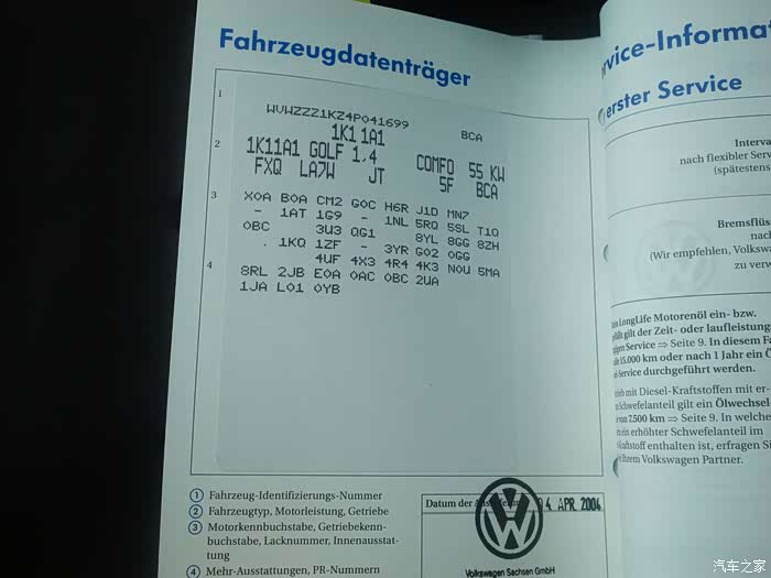 给大家一个保养手册里面PRCODE贴纸的照片,就是这些三位的数字字母组合的像密码一样的东西,是你车出厂时候选装的各个部件,包括排放标准、空调、音响、轮胎、轮毂、刹车、变速箱、发动机、气囊等等等等信息。
