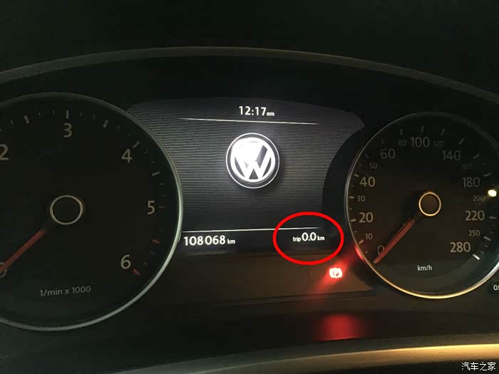 插钥匙上电,时钟归零到12:00,小里程表归零到0.0km(红圈)。