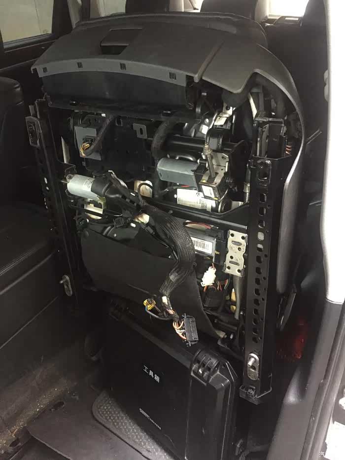 - 把座椅靠背电动往前调,然后把整个座椅手动向后排座椅翻起来。翻的时候要小心,座椅下面有线束,注意线束不要被扯断。