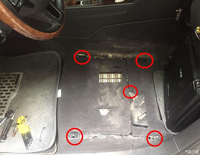 座椅抬走后的地板。5个红圈中,四角的是四个固定座椅的S2M10螺栓孔,中间一个是座椅下出风管的固定螺丝。