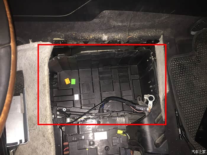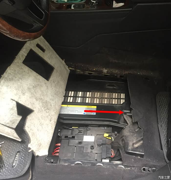 电瓶盖板终于可以拿出来了。取出来的时候最好留心一下取出来的角度和顺序,因为前后有地毯卡着,中间有个出风管挡着,拿出来不容易,一会儿放回去的时候也不让你省心。