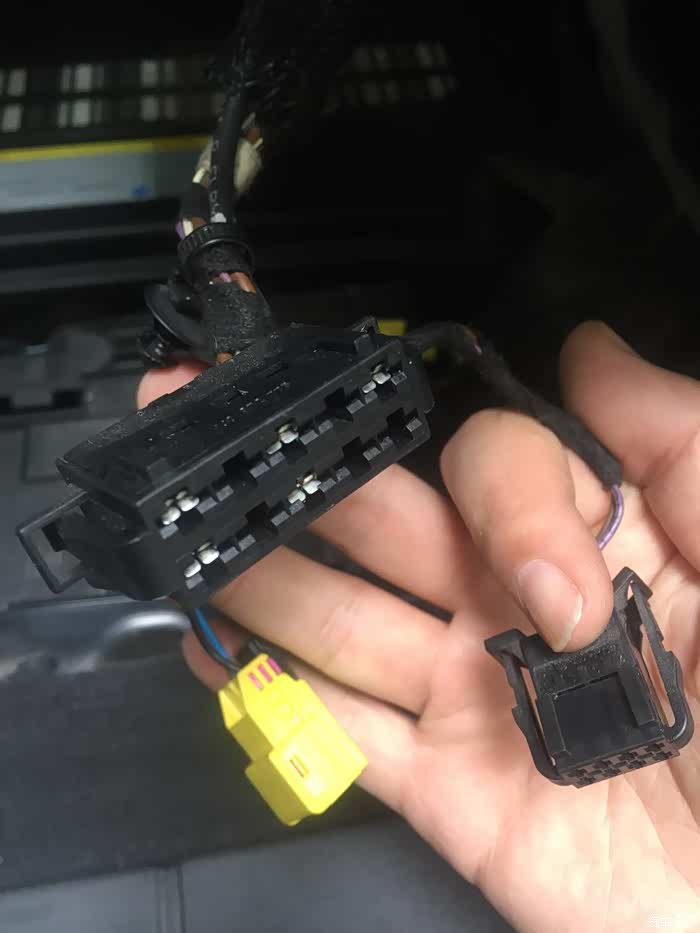 注意这个黄色插头是双保险的。需要先平移上面的黑色销,再按下,才能分离这个黄色插头。