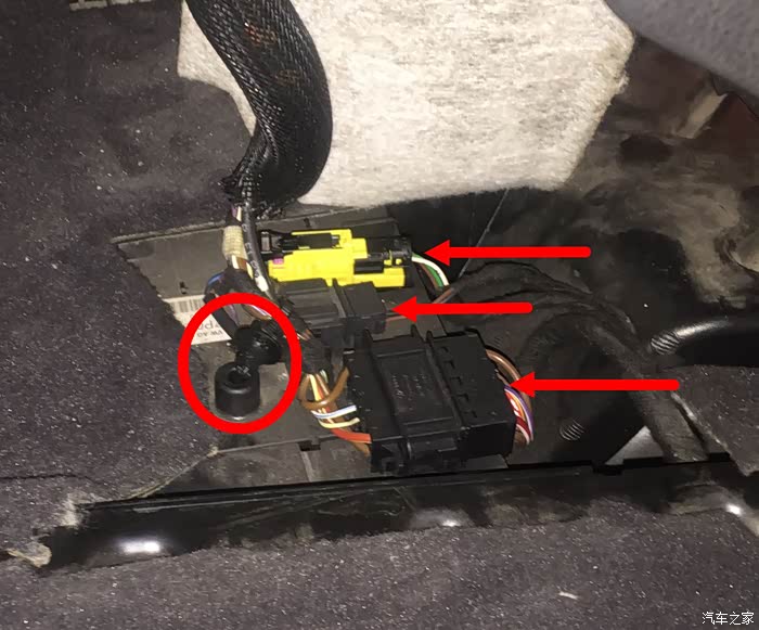 沿着座椅下的线束掀开地毯,露出三个插头(红箭头)也一个线束固定卡子(红圈)。