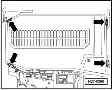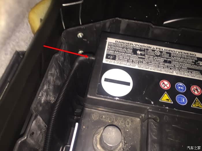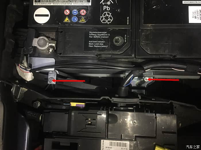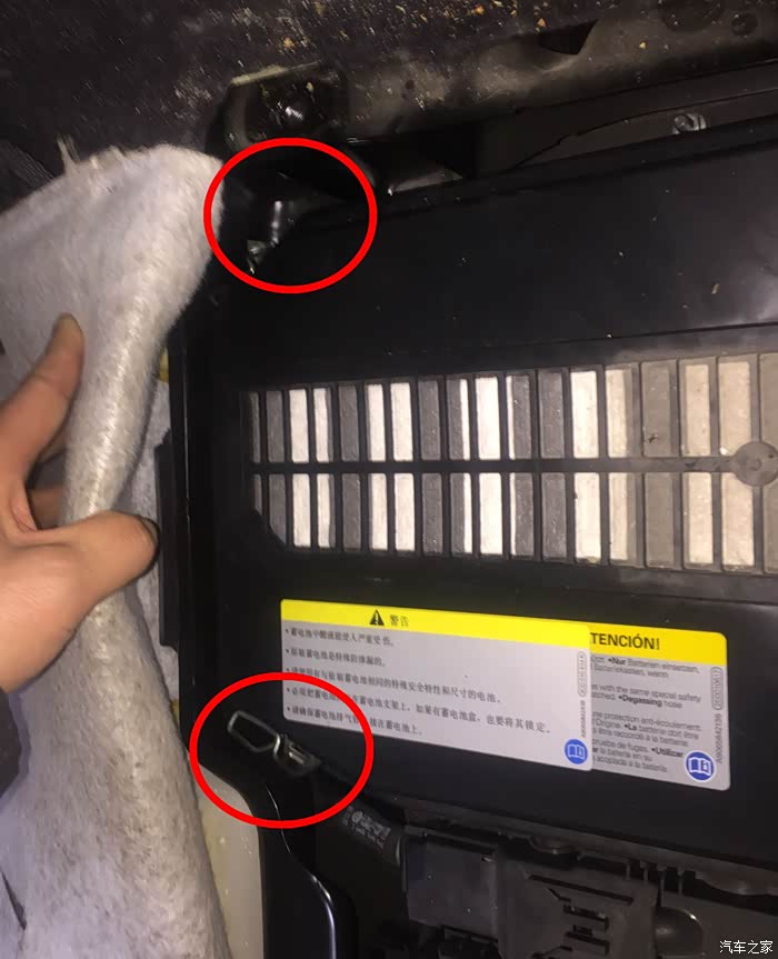 电瓶盖板被箭头所指的4个卡扣固定。这4个卡扣看着简单,但是其中有两三个真的很难打开,空间太有限了。用随车带的一字螺丝刀能凑合着翘一下。德国工程师四方脑袋怎么想的?