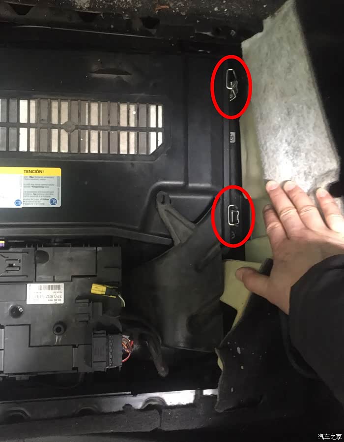 如果你的车没换过电瓶,就需要沿着箭头指的紫色虚线剪开地毯。