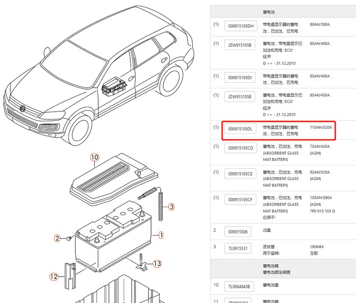 不同型号的途锐,用不同安时容量的电瓶,共8种(75AH, 80AH, 85AH, 91AH, 105AH, 110AH),见下图。AGM的三种是给带自动启停功能车用的。而且V10的柴途要用两块电瓶,估计是这个大柴油发动机需要的启动扭矩大,一个电瓶的输出电流都不够用了。