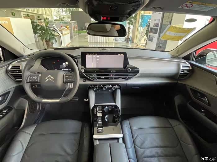 坐进车内,凡尔赛C5X在座舱氛围营造上要比雪铁龙之前的产品更加运动,这得益于整个前排中控台环抱式的设计和仪表盘的UI设定,但整体上来说,依旧更偏向居家、轻松的氛围,视觉感受上没有外观那样的惊艳感,整体布局相对传统,前排中央扶手也没有采用掏空增加储物空间的做法。