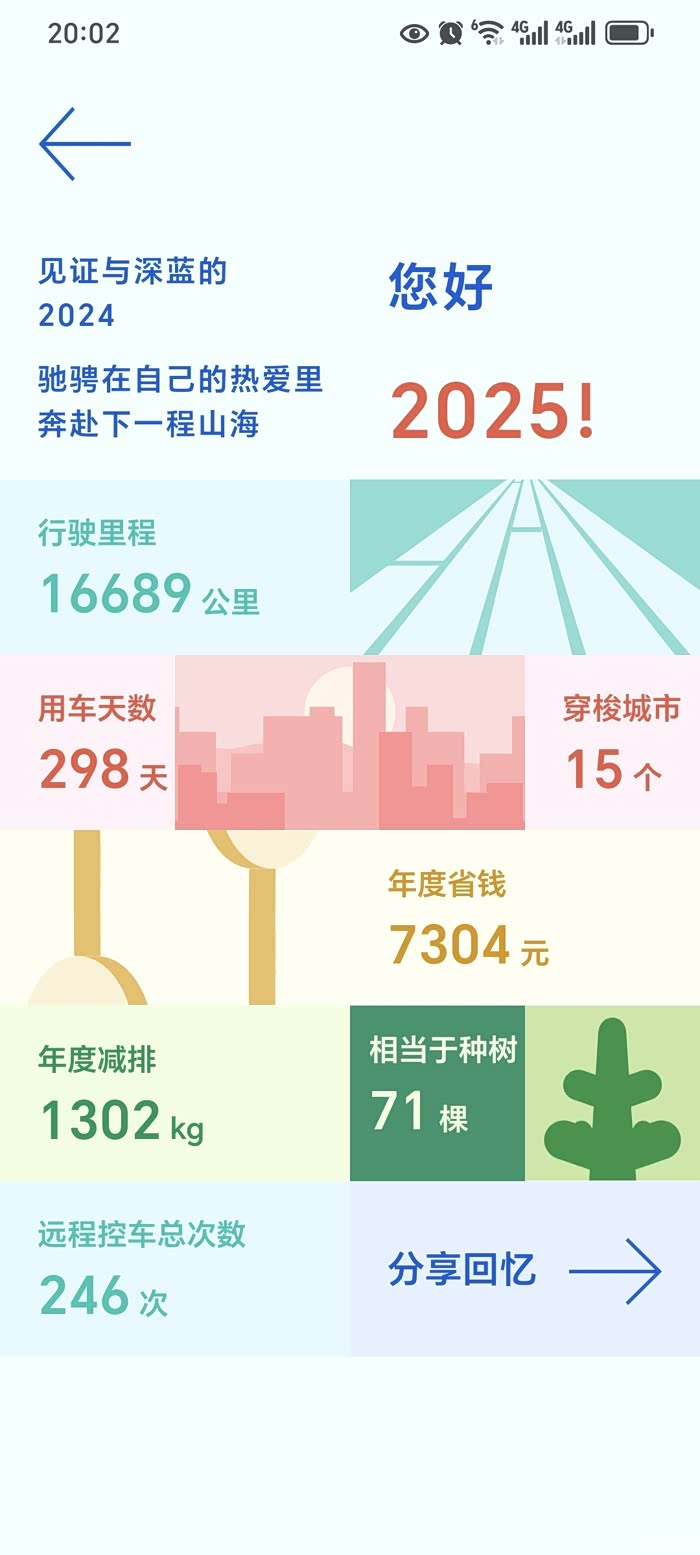 2024年,我的深蓝S7不仅是我的交通工具,更是我生活中不可或缺的伙伴。它见证了我的欢笑与泪水,陪伴我走过了一段段难忘的旅程。在这一年中,我年度省钱7304元,相当于种树71棵,年度减排1302kg,这些数字不仅仅是节能的体现,更是我对环保生活态度的坚持。