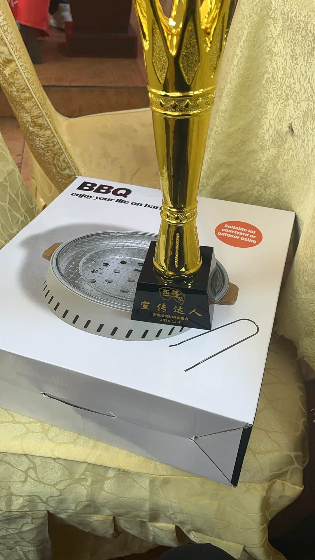 下午的互动游戏更是将氛围推向高潮!抢凳子的紧张刺激、掷铅桶的趣味比拼、接力倒水的默契协作,每一个项目都充满了欢声笑语。不管是参与者还是获胜者,都拿到了丰厚的奖品,让人拿到手软。更让人惊喜的是,凭借这6个多月的积极推广,我还收获了专属奖杯和烤炉、折叠桌等实用好礼。