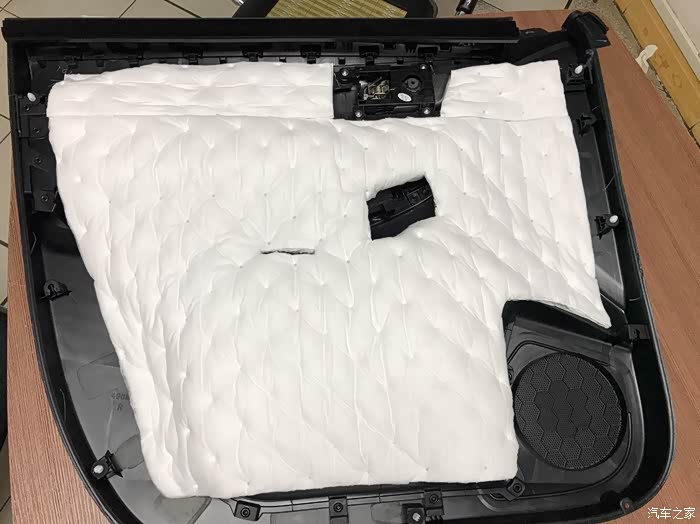 最后是车门饰板,贴上一层白色隔音棉,这里只能用10mm厚度的,网上还有一种25mm厚的会顶住饰板扣不回去