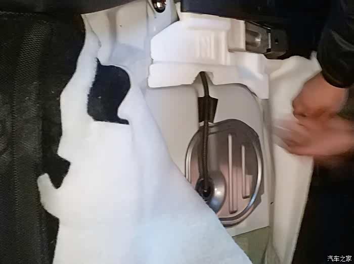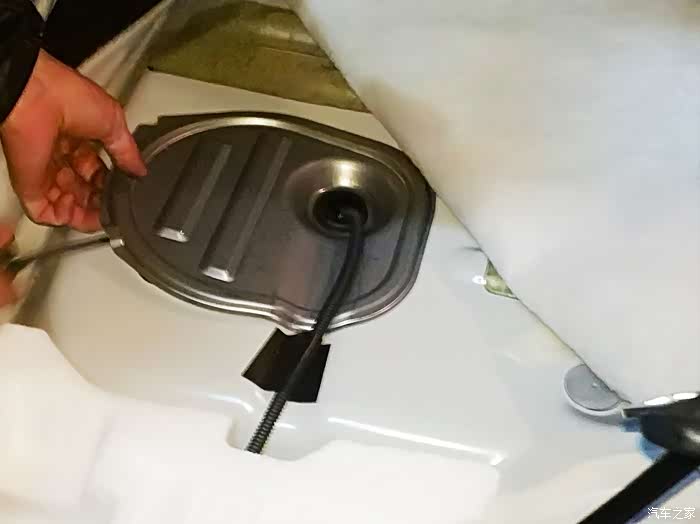在揭开地毯,就看到了燃油泵盖子,技术人员说下面就是油泵