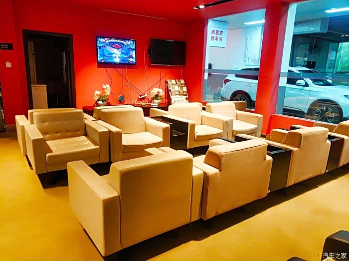 展厅休息区可以看到维修车间,边喝茶边看修车