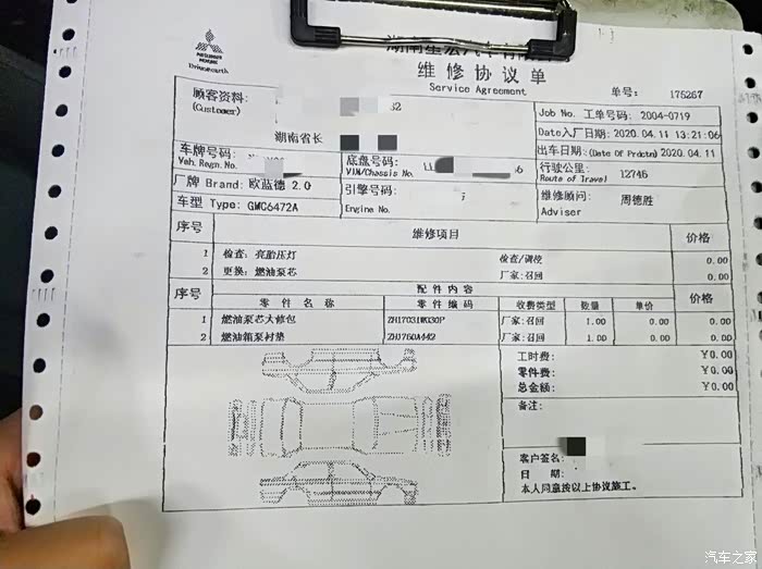 然后售后接待的小哥打了一张售后单给我,换燃油泵和升级胎压一起打包搞了