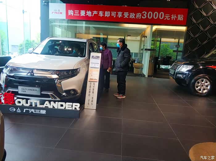 横幅上写着买三菱地产车补贴3000,估计是政府在疫情期间做出的购车优惠政策来促进汽车消费