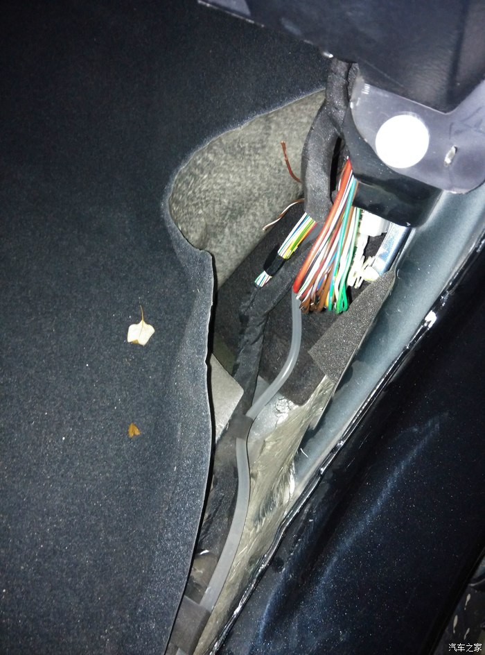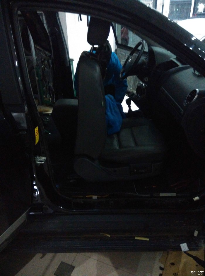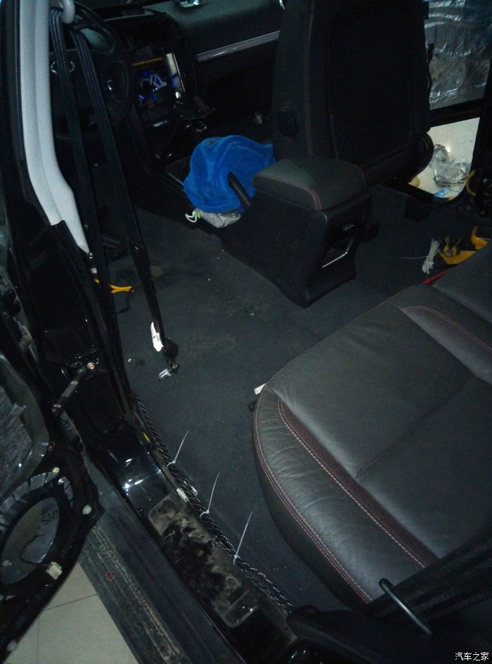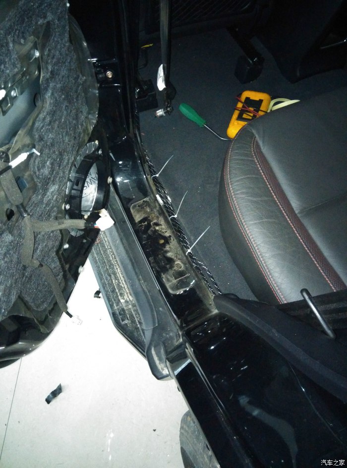 走线~~~这店很严谨的遵照了音响改装音频线电源线分开走的原则。电源线干脆直接把我的主驾驶座位拆了,走的扶手箱旁边。音频线走的门两侧。电源用的8#线,音频线用的是怪兽线。