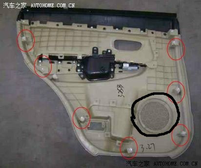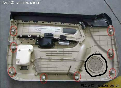 图中黑圈部位,在喇叭罩的附近有一圈塑料,由于JBL的喇叭外圈比原装喇叭要大那么一点,所以在大音量播放音乐的时候,喇叭会震到这一圈塑料,带动整个门板共振。后来在自己加隔音棉的时候把整个这圈塑料全部用小刀割掉,问题立马解决了,这个问题如果长时间不解决,会损坏喇叭。请哈友一定要注意!!!