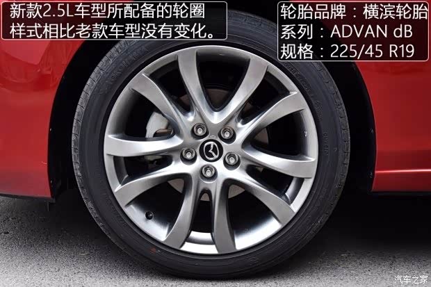 再看17款-18款开始换上的横滨胎,ADVAN虽然号称横滨的运动系列,但是外行人通过肉眼就能看出来,做工和胶质就不如韩泰,横向比较属于中低端静音型运动胎,我前面也说了,相对韩泰来说,属于一马偷梁换柱的减配胎,胎纹属于静音型,更细更浅,每条胎纹之间空隙小,压强小,静音效果自然更好(不过实际使用中感觉噪音也并不比韩泰低很多,何况17款开始整车隔音也加强了,比如多了双层玻璃和很多隔音棉),但是胶质软,抓地力和排水性一般,只适合家用,不适合激烈驾驶,这就是很多新款车主感觉比老款更刹不住,ABS更容易踩出来的原因。用耐磨度、强度和操控性换来静音,加之新款底盘调教比老款更舒适,所以喜欢马自达操控感的车友应该会更喜欢老款的驾驶风格。目前新款上市一年了,我观察过跑了几千和跑了一万多还有两万多的车友轮胎,横滨的胎纹明显磨的比韩泰快很多,正常路况使用四万左右的横滨花纹几乎已经快到了轮胎换胎的极限了,如果路况再差点,开车习惯又喜欢极端驾驶后者急刹车,那寿命会更短。胎纹低于警报线以下的话,不但排水性和抓地力会变差,爆胎率和防扎性也会变差。建议大家横滨胎三万后最好经常观察,不行了就要及时换,估计寿命也就五万左右。远低于韩泰。而且为了静音使胶质较软花纹较细较浅,不但不耐磨,而且还会影响承载力和扛冲击力,说白了就是强度低,不耐碰,更容易扎钉子容易破损容易容易鼓包容易爆胎。。。