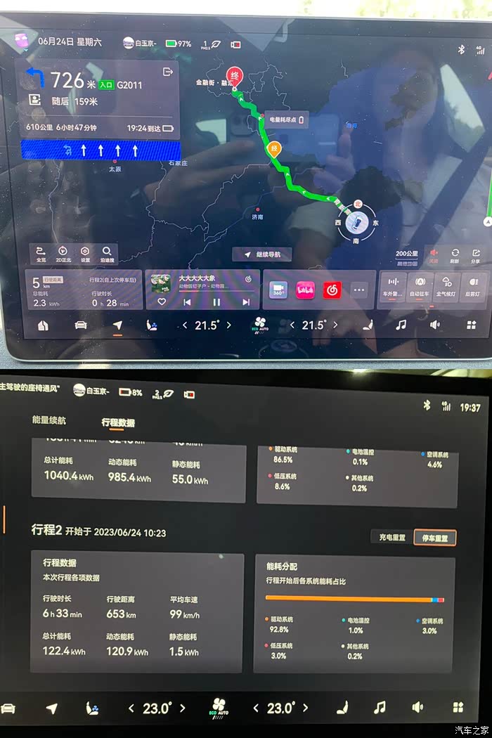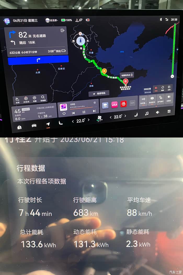 3. 青岛至北京,总距离653km,总能耗122.4kWh,总时间6h33min,百公里能耗18.7kWh/100km,均速100km/h。