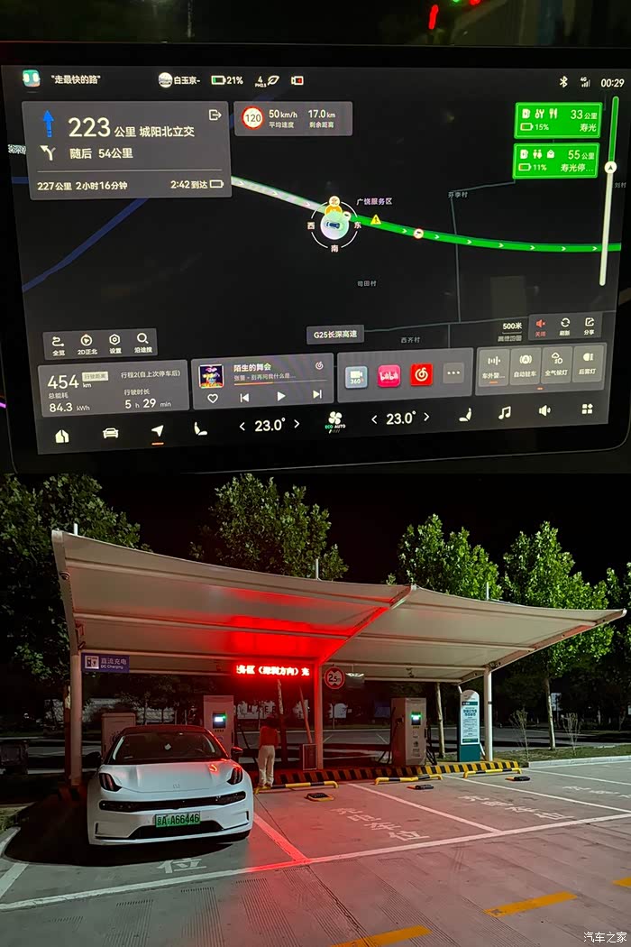 在北京有家冲桩,必须满电出发!自从有了动态能耗,我一直使用动态能耗,因为动态能耗是根据前50km(听说)的驾驶习惯,自动估算的剩余续航能力,算是比较贴近于实际续航的数值,具有很大的参考意义。北京市区正常上下班我从不刻意追求节能,正常行驶的满电续航641km,如果走国道,说不定真能不补能一把到青岛。但高速能耗肯定比市区高,所以我保守按照400km不能来计算,在地图上可以选择补能距离,地图会自动推荐设定距离值附近的补能点,我选择广饶服务区补能。我晚上9点满电从北京出发,一路畅通,高速上基本LCC130或者ACC140,在凌晨00:30到达广饶服务区,剩余电量21%。这个服务区离寿光非常近,有很多大货车,大家晚上要小心驾驶啊!服务区有两个国网120kw的快充桩,每个桩两把枪。我去的时候没有车在充电,所以充电速度达到100kw,还算不错。充完电在服务区休息了三个多小时,然后继续出发!早上7点十分到达青岛万达超冲桩,在家奶的感觉太好了没有没!在APP能看到从万达停车场入口一直到充电桩的详细线路图,充电10分钟减免1小时停车费,加上锦鲤充电券,一度电7毛5,太香了!