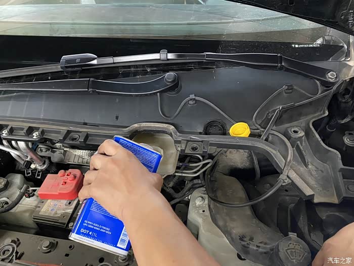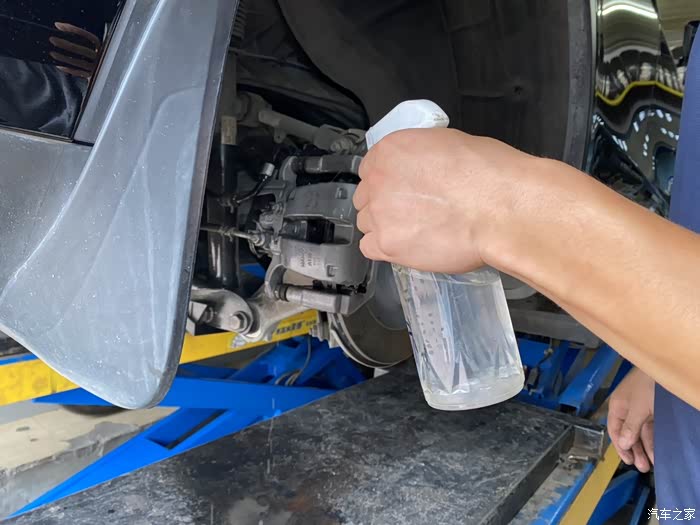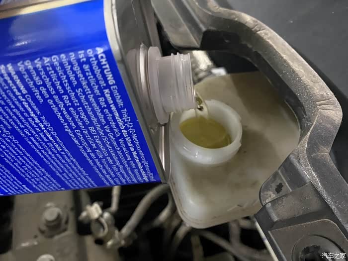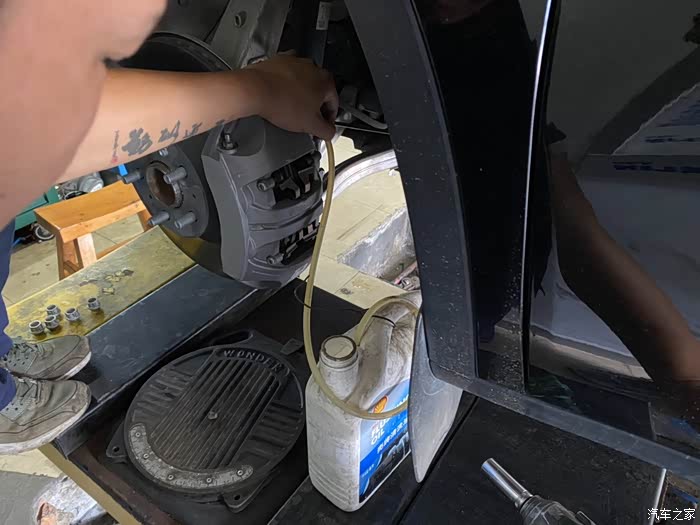 换刹车油说起来其实也方便,最简单的人工方式是重力换油,把车抬起来以后,给油壶倒入新油,按照左前-右后-右前-左后的顺序依次拧松刹车卡钳的放油螺母,让新油把旧油顶出来就完事儿了。