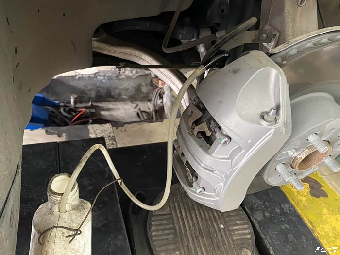 具体操作一般需要3个人,一个踩刹车踏板(建立管路压力),一个给卡钳放油,一个给油壶加油。