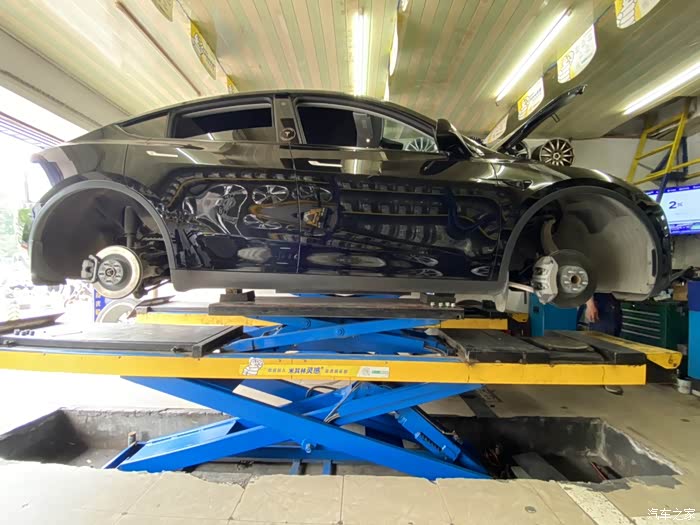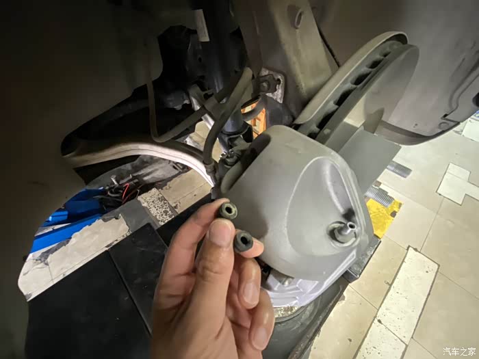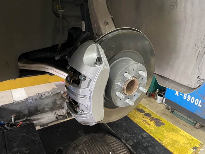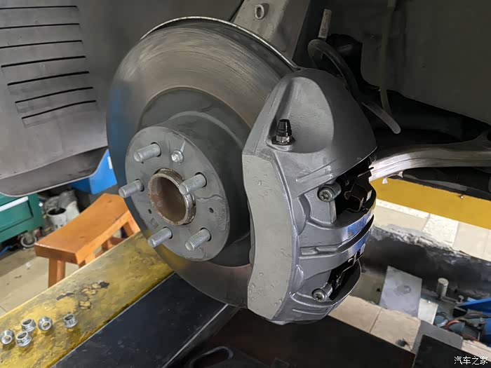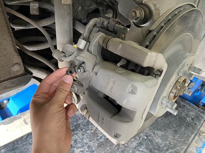 上架子,拆轮子,前卡钳是对向活塞,两个放油螺丝,后卡钳一个。