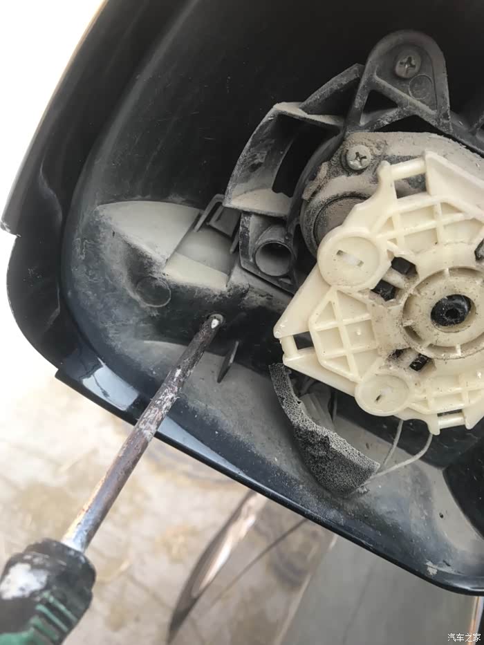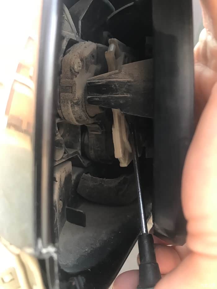 把玻璃外侧间隙调到最大,长一字改锥侧面插入玻璃背面的白色底座,这个白色底座和玻璃撬开就可以了,注意玻璃别掉地上,然后是转向灯的两颗螺丝,下面是拆卸螺丝