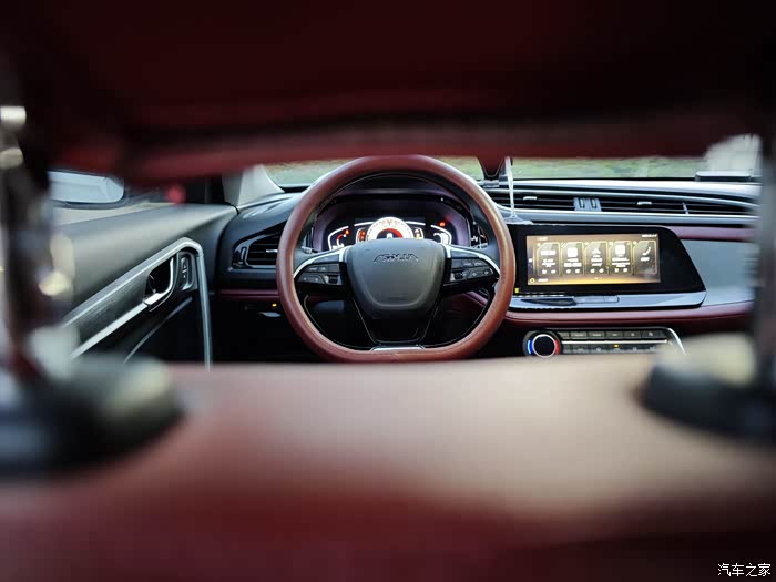 红黑拼色的用了大量皮质软包,坐进车内很有质感
