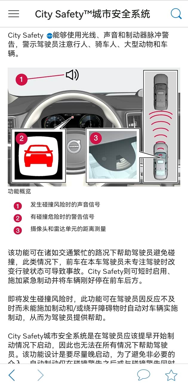 说说这车的几个优点吧,个人观点,第一个就是安全功能配置全系标配,最低配置车型也有这套东西—沃尔沃的城市安全系统,由摄像头跟毫米波雷达组成的一套系统,看网上一些视频宣传的神乎其神,那个主动避让咱也确实没实际体验过,(当然最好别体验)碰撞预警跟主动刹车倒是感受过几次,无论是开车走神还是开车发飙,那个嘀嘀嘀声音一响,开车就老实了,开车还是安全第一,不出事比啥都强。