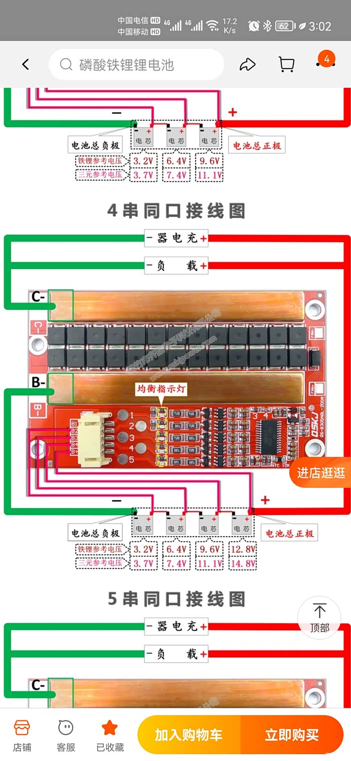 这是4串铁锂带均衡保护板,最大放电电流500A。之前买了两款都不成功启动,可能是电流达不到,这个板子做工好,原装带了10平方的硅胶线,负极连接线都用不着了