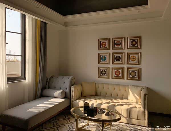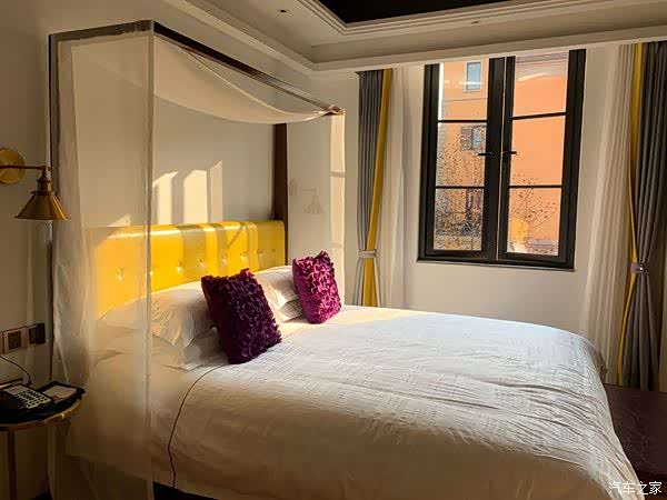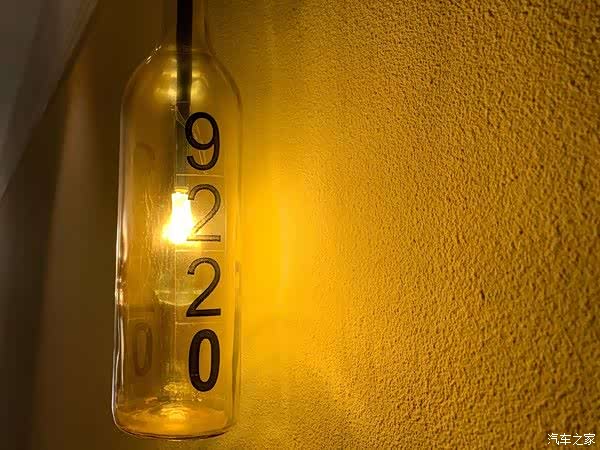 啤酒瓶的门牌、泛着金属质感的壁灯,黄色的软包床头,