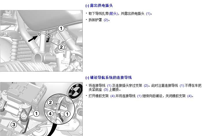 这里是重点,请注意车架钢管内侧有一个宝马预留的电源插头,可以扩展导航。。与点烟器共享50W的功率,带电子保险,过载保护。这个插头就在油箱左侧下方,很好找。