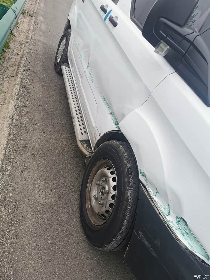 ,睡梦中就忽然感觉车子撞东西了,当时心里还是害怕的,毕竟开了这么多年车没出过事故,好在当时是早上6点多,那条高速又没什么车,就只是擦到了护栏上,最后陪了一节护栏,不到900快,车子右边蹭到了,不过啥事没有,后来报警后之后就直接开去4S店修了,担心修车技术不好,就直接要求4S店换了两个门,不得不说,新款全顺的地板还是很稳的,蹭了护栏之后,车子没有任何的失控,跑方向,一脚刹车就稳稳的停了下来。这点还是要攒一下福特的底盘的。下面是事故图片
