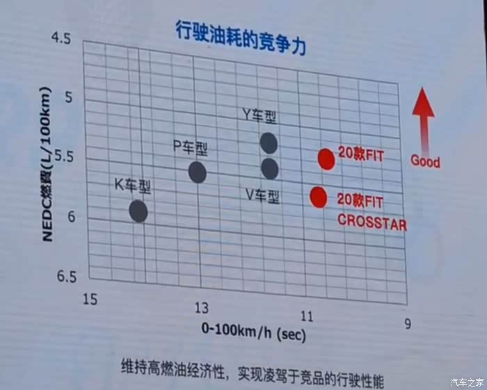 这是广本飞度发布会上的PPT里面的图片,从图片可以看出,横坐标是秒(越左越慢),纵坐标是油耗(位置越高油耗越低),飞度sport版本的“官方”零百加速是:10秒6左右(横坐标一个小格子是0.4S),NEDC油耗:sport版本是5.3左右,crossstart版本是5.6左右。