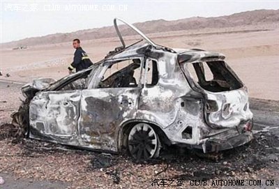 从车祸现场图片,我们可以看到,大众途观SUV与一辆货车发生追尾,撞击货车尾部的油箱后,发生爆燃,将途观付之一炬。