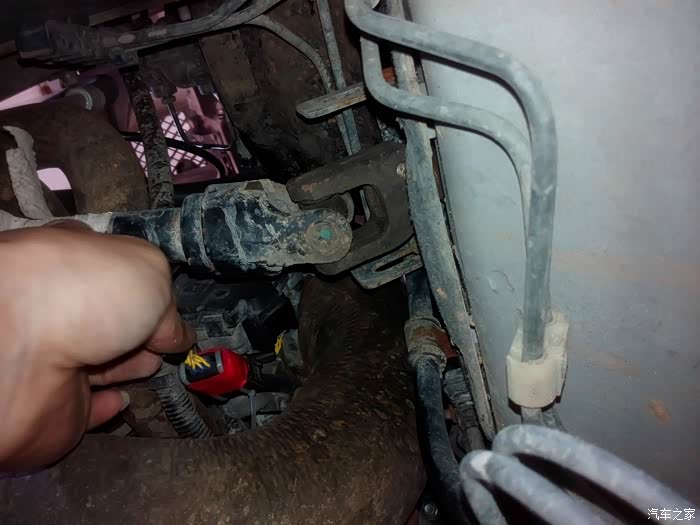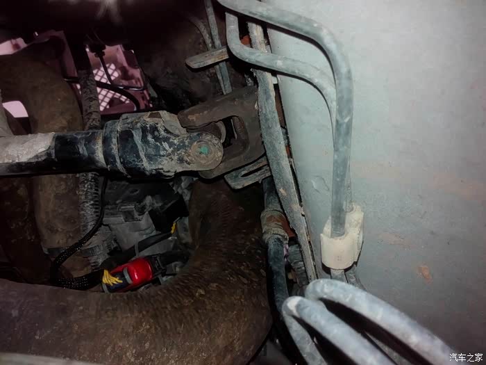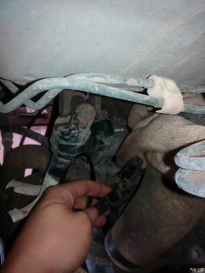 从车底看到节气门接头,个子矮的车友还是别从车底安装了,不光需要修车的升降机,就是升起来了也难于够摸到节气门的位置。卸掉左前轮胎,从侧面安装比较方便。