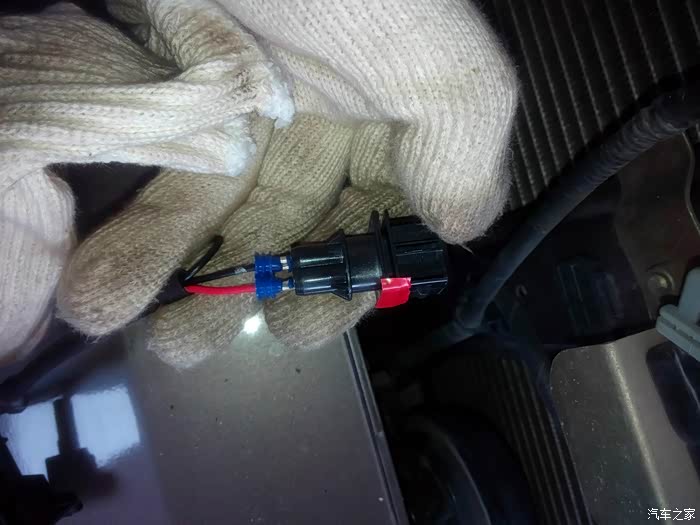 组装好的插头在正极一侧也用红胶带标示,然后拿到车上与从涡轮拔下来的控制线对接。