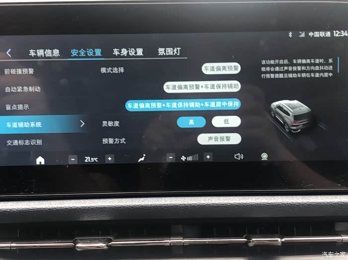 灵敏度、还有一些功能的开启和关闭,都可以在安全设置里面调节,确实是比较人性化了,像我就把那些能调灵敏度的全调成了高,毕竟和媳妇都刚拿驾照没多久,灵敏度高一点,开起来还是会更放心一些。