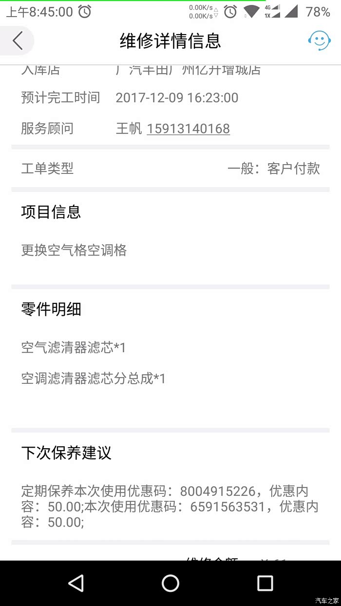 只换空气和空调滤芯的单,用50的工单和50元的保养券都能扣