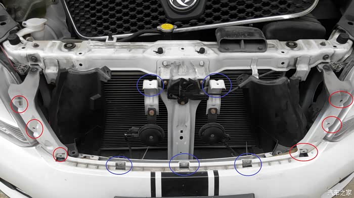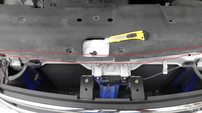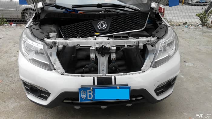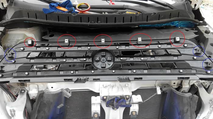 1.拆开中网上边那块板,那一次性卡扣要小心点拆,很容易拆坏,毕竟是一次性的。可以先到修车店的地方买几个,或者让他们送几个,我就拆坏了2个。