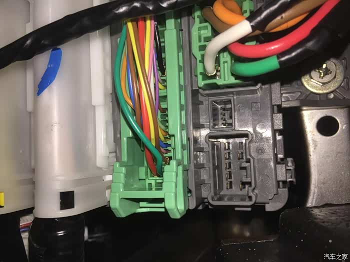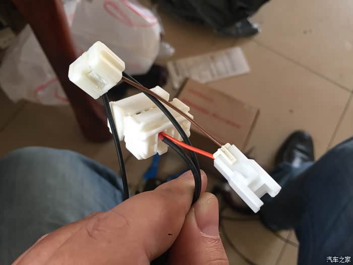 这就是做好了线的插头,胎压监测正极直接接到选装插头上,并联的是防炫目后视镜的插头。上方的白块是并联取电线,把两根搭铁线集合成一根。