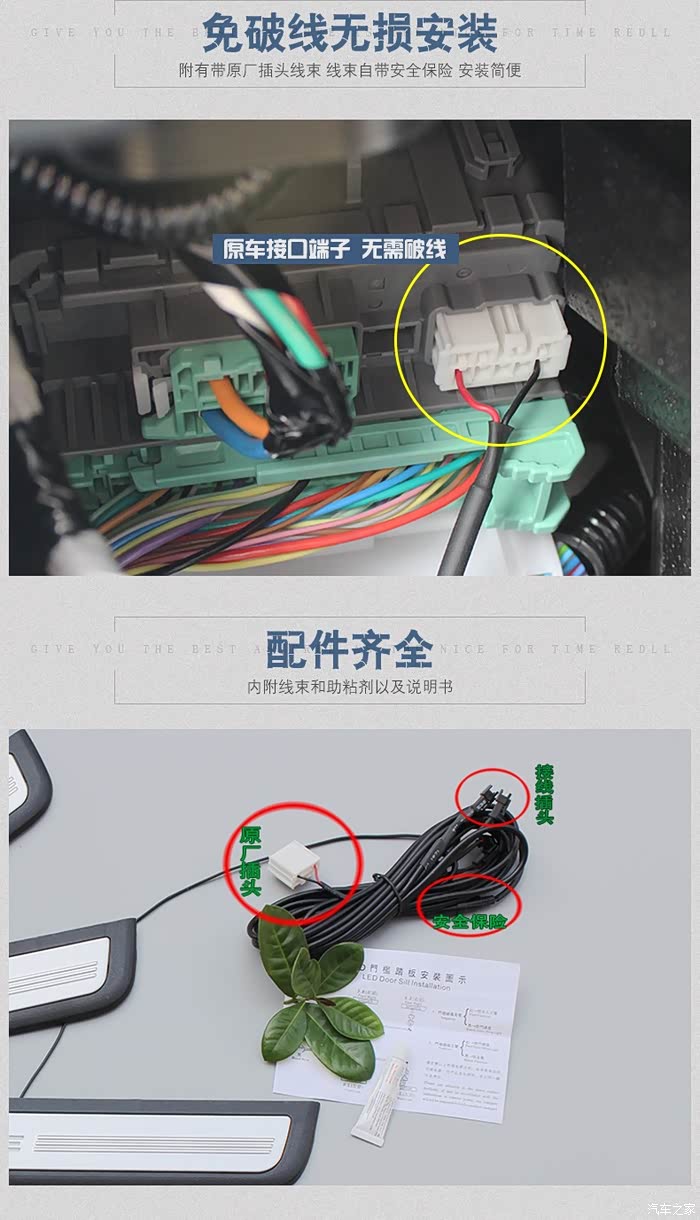 取电我们肯定要用车里面的接线盒,拆卸位置和方式我就偷个懒,用马云家卖迎宾踏板的图了,大家看仔细了,因为我们就要在这个白色的插头的插座上动手脚了,这就是原厂的解决方案。当然还需要我们去马云家购买这个白色的插头,你可以让商家做好线,也可以买线、插头和杜邦签字自己做,我就是这么干的。如果你嫌麻烦,那么你直接用取电线就好了,也就不用往下看了。