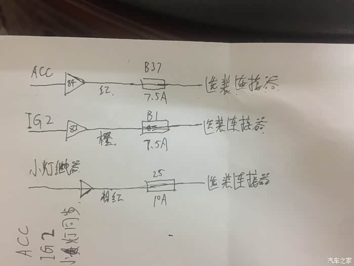 其实和我的上篇安装广本原厂的内置胎压监测一样,想偷懒呢就用取电线直接保险盒取电,但是我用的是原厂的选装配件走线方案,更加的科学和安全,也非常符合我这个强迫症患者的作风。通过对于杰德电路原理图的研究,选装件的电源一共有三种方案:1、ACC,这个大家都懂,插入钥匙拧第一档或者一键启动按一下,这个时候就有电了;2、IG2,这个其实是钥匙拧第二档或者一键启动按两下,这个时候才有电,也是本田选装配件的取电方案;3、开灯同步,也就是说无论你车启动或者插钥匙与否,只要拧开车灯就有电,因此适合用于车内的氛围灯取电。需要注意的是,三个方案的保险丝规格,不要超了负荷。